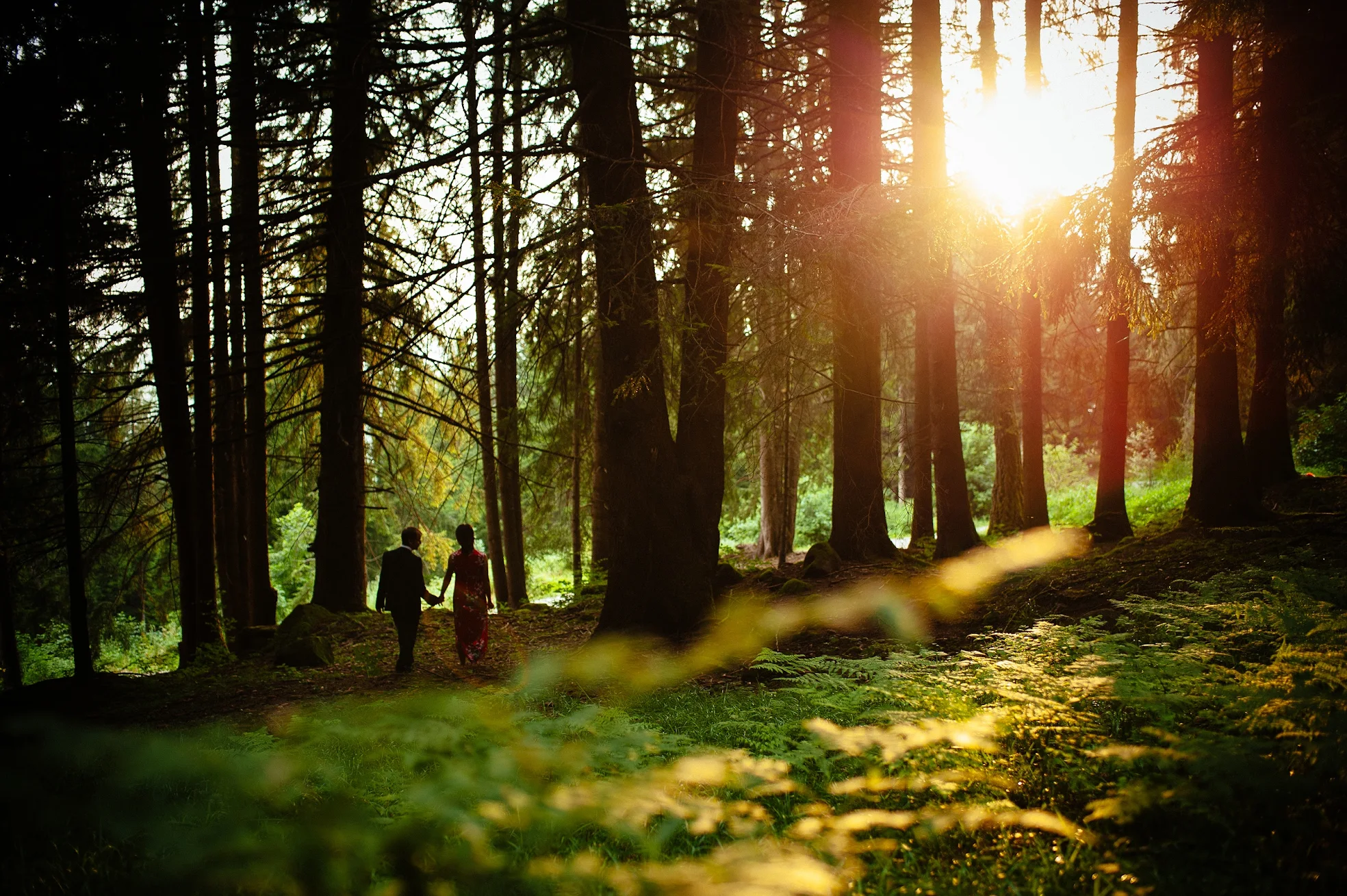 The Dolomites are remnants of ancient coral reefs, their distinctive pale towers rising dramatically from green meadows. The vertical faces, the jagged skylines, the sheer scale — photographing couples against these peaks creates images of almost impossible grandeur. The mountains dwarf everything else, yet somehow make the human moments more intimate by contrast.